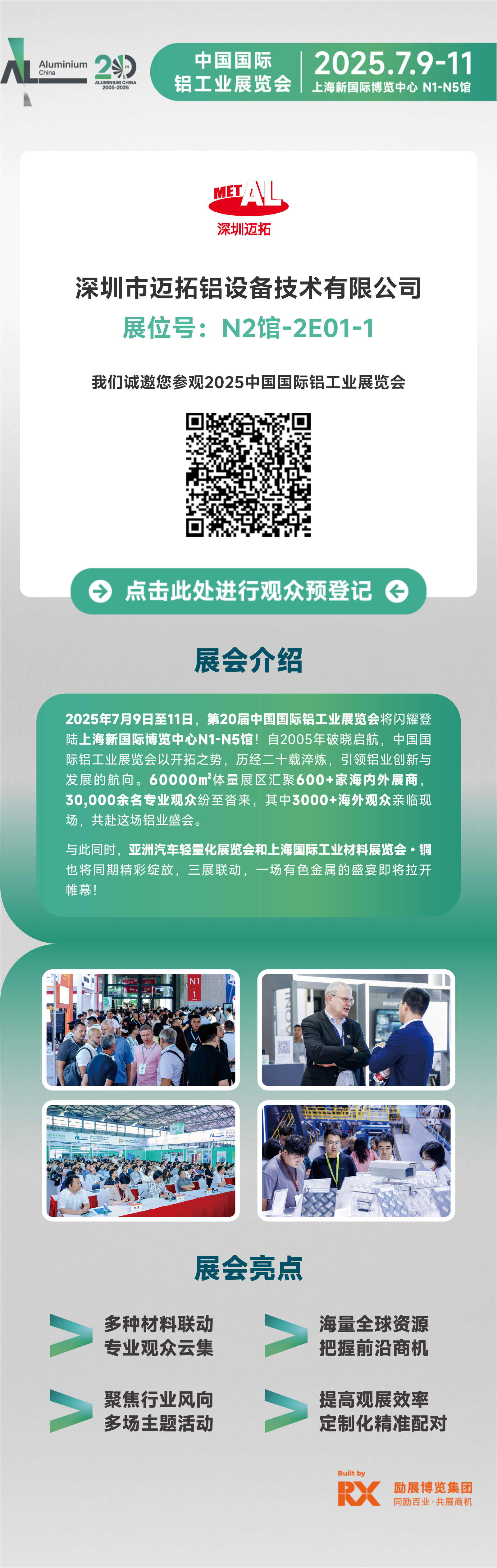第二十屆中國國際鋁工業(yè)展覽會(huì)將于 7 月 9 日至 11 日在上海市新國際博覽中心盛大啟幕,屆時(shí)將有 600 多家海內(nèi)外展商齊聚一堂。深圳市邁拓鋁設(shè)備技術(shù)有限公司成立于2006年,擁有一支專業(yè)的研發(fā)、設(shè)計(jì)、生產(chǎn)和施工隊(duì)伍,提供產(chǎn)品和服務(wù)的范圍包括整個(gè)鑄造車間,目前已經(jīng)為國內(nèi)外近300家鋁加工廠提供了多達(dá)500余套的設(shè)備和產(chǎn)品服務(wù)。